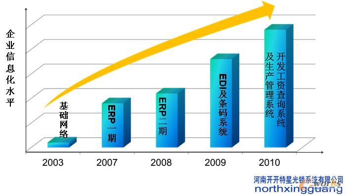 隨著企業(yè)信息化和汽車行業(yè)的發(fā)展,2008年到2010年銷售收入有了較大的增長,客戶遍及全國各地。開開特星光鎖業(yè)從2003年開始信息化之路,信息化發(fā)展歷史是:2003年做了內網,2007年是ERP一期,2008年做了ERP二期,2009開始做了EDI的條形碼,2010年做了公司查詢系統(tǒng)和生產管理系統(tǒng)。