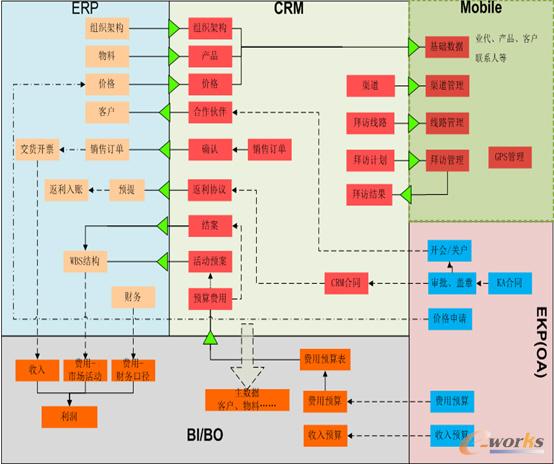 之后我們開始了CRM的實施,目標是建立、健全客戶視圖數據;強化銷售預算及線路活動;管理市場推廣和營銷活動;加強渠道的可視化管理;打造完整的客戶價值鏈;開啟銷售、市場全面分析。我們選擇了上海和河南的2個分公司,所涉及的業(yè)務就是包含了客戶管理、拜訪管理、資金管理、預案管理、資產管理、訂單管理、渠道進銷存、合同返利管理,CRM功能集中在營銷和銷售管理兩大模塊。CRM是從2010年的6月開始實施的,經過半年的時間,2010年底上線。在CRM實施的時候,三全食品已經實施了SAP的ERP系統,這就面臨著一個系統的集成問題,不僅僅是CRM,還有其他的系統也需要集成。圖3就展現了目前三全食品的系統集成情況。
