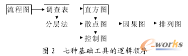 質(zhì)量管理的七種基礎(chǔ)(B7)工具是60年代由日本的石川馨博士習(xí)等當(dāng)時常用的質(zhì)量控制方法編纂在一起而形成的。主要包括分層法、調(diào)查表、直方圖、散點圖、控制圖、因果圖和排列圖。這七種工具屬于統(tǒng)計方法的范疇,在質(zhì)量管理過程中用于分析存在的問題,并在使用上有一定的邏輯順序(如圖2)。