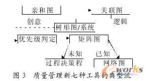 質(zhì)量管理的新七種(N7)工具是70年代日本質(zhì)量控制技術(shù)開發(fā)協(xié)會的研究成果。主要包括親和圖、關(guān)聯(lián)圖、樹形圖(或稱系統(tǒng)圖)、優(yōu)先級判定矩陣、矩陣圖、過程決策程序圖(或稱PDPC法)和網(wǎng)絡(luò)圖(或稱箭條圖)。它彌補了B7不能處理非數(shù)字信息(語言文字)的不足,以語言、圖形為主要研究問題的方法。由于其一種工具可為另一種工具提供輸入信息,故建議用一種"活動循環(huán)"的方式使用。(如圖3)。