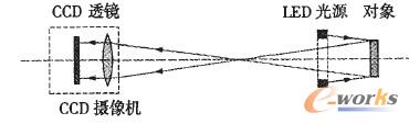 必須指出,與以上精密測量中機器視覺系統(tǒng)采用的透射方式(又稱“背光”方式)不同,用于表面缺陷探測時,需采取圖3所示的反射方式。