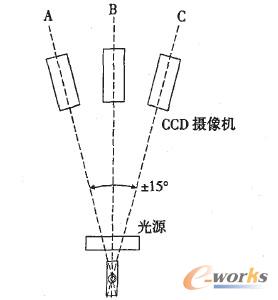 根據(jù)被測對象的特征(工件形狀、被測部位)和要求,參照視覺系統(tǒng)產(chǎn)品的有關標準,并按照所完成的設計,將能方便地選取合適的圖像檢測單元(器件),組成相應的檢測系統(tǒng)。以連桿結合面爆口為例,其系統(tǒng)的檢測要求如圖4所示,即分別檢測互為15。夾角的A.B.C三個(連桿側面的)破口面,最終以三個檢測結果中的最大值作為破口的真實值,進行判斷后并輸出結果。圖5為該系統(tǒng)組成示意圖,其中: