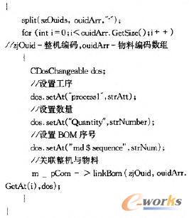 本系統(tǒng)采用了AtucCAD作為設(shè)計平臺,Orade9i作為數(shù)據(jù)庫,開發(fā)工具選用的是VC++.NET。本文第4個章節(jié)描述的構(gòu)建產(chǎn)品結(jié)構(gòu)樹的過程,其中添加多個物料到整機(jī)BOM中的關(guān)鍵代碼如下: