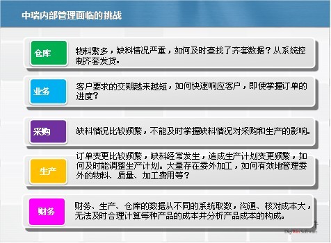 基于以上需求和問題,中瑞公司領(lǐng)導(dǎo)層認(rèn)為:企業(yè)現(xiàn)有管理以及使用系統(tǒng)已無法實(shí)現(xiàn)信息的集成與共享,更難以適應(yīng)多樣化市場的競爭需要,為此,公司決定引進(jìn)ERP企業(yè)資源計劃管理系統(tǒng),以建立快速的信息獲取、處理和響應(yīng)機(jī)制,改革企業(yè)傳統(tǒng)的生產(chǎn)組織模式和管理方式,優(yōu)化企業(yè)的業(yè)務(wù)流程和資源配置,努力降低產(chǎn)品成本,不斷開發(fā)出貼近市場需求的新產(chǎn)品,為客戶提供最優(yōu)質(zhì)的產(chǎn)品、最優(yōu)良的服務(wù),以適應(yīng)配套市場競爭需求。