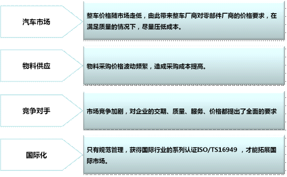 常州博萬達(dá)汽車安全設(shè)備有限公司主要為汽車主機(jī)廠提供配套的各種類型的汽車安全帶產(chǎn)品。隨著中國汽配行業(yè)市場的日益擴(kuò)大,博萬達(dá)的業(yè)務(wù)量也與日俱增,與此同時(shí)市場競爭也逐漸加劇,對于企業(yè)的產(chǎn)品交期、質(zhì)量、服務(wù)、價(jià)格等都提出了新的要求與挑戰(zhàn)。