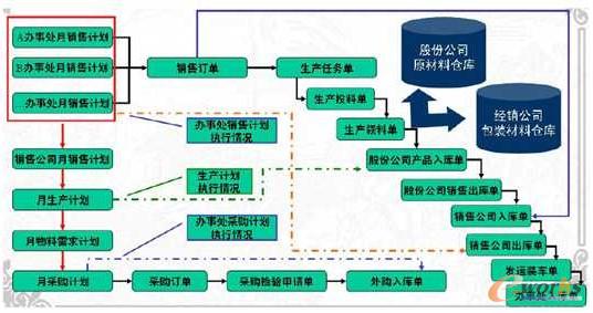 從上圖可以看出,河套酒業(yè)包括股份公司、生產(chǎn)公司、銷(xiāo)售公司、辦事處等獨(dú)立核算的實(shí)體或分子公司,但是實(shí)際上整個(gè)供應(yīng)鏈系統(tǒng)是完全集成在一起的。孤立的解決上述問(wèn)題,只能帶來(lái)重復(fù)工作量、公司間相同業(yè)務(wù)不一致以及滯后、市場(chǎng)反應(yīng)不及時(shí)等問(wèn)題。因此跨公司實(shí)體,實(shí)現(xiàn)銷(xiāo)售計(jì)劃、生產(chǎn)計(jì)劃、采購(gòu)計(jì)劃三大計(jì)劃集成、物流集成是白酒類(lèi)生產(chǎn)企業(yè)供應(yīng)鏈系統(tǒng)信息化的關(guān)鍵。