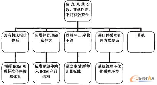 設(shè)備制造廠計算機管理技術(shù)在生產(chǎn)與經(jīng)營管理方面的應(yīng)用方面也顯得比較薄弱,僅在工裝產(chǎn)品的訂貨和生產(chǎn)計劃的制定、組合機零件清單的制定上有一定的應(yīng)用。為了改變這種狀況,設(shè)備制造廠在1997年開始進行MRP-II軟件的選型,并與美國的SYMIX公司達成協(xié)議,希望通過他們的SyteLine軟件改變工廠生產(chǎn)經(jīng)營管理信息系統(tǒng)的狀況,由于種種原因,諸如推行力度不大、有關(guān)部門抵制、產(chǎn)品品種多、BOM(物料清單)難以建立、軟件的本土化工作不夠、尤其是財務(wù)系統(tǒng)不符合中文習(xí)慣等等,導(dǎo)致軟件沒有實施成功。在此次ERP系統(tǒng)面臨具體的業(yè)務(wù)中,以沒有機床報價體系、新增件管理隨意性大、進口件管理環(huán)節(jié)繁瑣、原材料出庫物不符等一系列典型的問題急需要作為基礎(chǔ)問題解決,如圖6所示:
