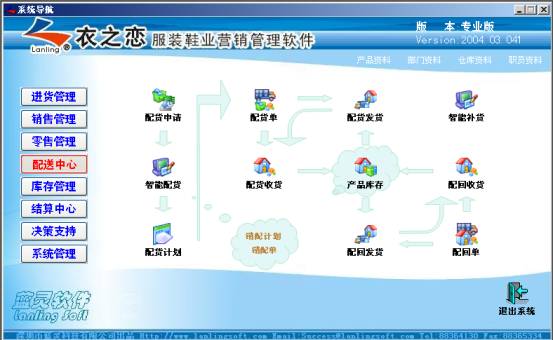 (6) 總部配貨:總部(配送中心)收到各門店的要貨申請單(配貨申請)后,根據(jù)庫存情況進(jìn)行配貨?偛浚ㄅ渌椭行模┮部梢愿鶕(jù)新款服裝自動(dòng)生成對各門店的配貨計(jì)劃,由總部(配送中心)主動(dòng)向門店進(jìn)行配貨。衣之戀自有智能配貨功能模塊,配送中心通過對門店的銷售日報(bào)和庫存日報(bào)可形成統(tǒng)計(jì)分析報(bào)表,并且進(jìn)行回歸性分析,自動(dòng)給出配送趨勢及建議,進(jìn)行主動(dòng)調(diào)貨或配貨處理,可以人為主觀生成也可以自動(dòng)生成配送計(jì)劃。配送模塊如下圖所示: