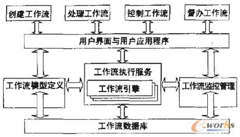 工作流程管理上要包括三個(gè)部分。工作流服務(wù)是整個(gè)系統(tǒng)的核心,工作流的模型定義與監(jiān)控管理都同用戶相關(guān)聯(lián),用戶通過應(yīng)用界面及系統(tǒng)提供的功能定義工作流模型,監(jiān)控管理工作流,軟件結(jié)構(gòu)如圖3所示。該模塊屬即時(shí)性、基于數(shù)據(jù)庫并由任務(wù)驅(qū)動(dòng)的工作流管理系統(tǒng)。為了提供良好的靈活性,適應(yīng)工藝設(shè)計(jì)流程中的變動(dòng),用戶在模塊中自定義工作流,并允許用戶在運(yùn)行過程中修改工作流,因此是即時(shí)的。工作流是根據(jù)用戶自定義的工作流程執(zhí)行的,只有當(dāng)前一個(gè)工作項(xiàng)完成后,后一工作項(xiàng)才被創(chuàng)建,因此是任務(wù)驅(qū)動(dòng)的。