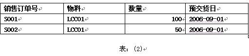假設(shè)有如下兩筆同一物料的銷售訂單(表:2),該物料現(xiàn)有庫(kù)存=0。為簡(jiǎn)單起見,沒有預(yù)設(shè)任何預(yù)計(jì)生產(chǎn)入庫(kù)和預(yù)計(jì)出貨的數(shù)量。
