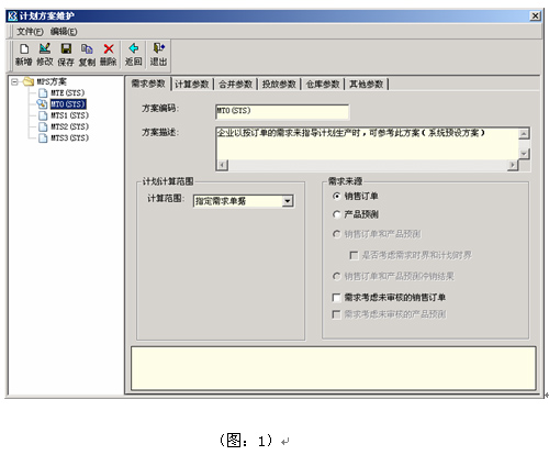 1) 在MRP計(jì)算時(shí),計(jì)劃方案中選擇MTO,計(jì)算范圍為“指定需求單據(jù)”,需求來源為“銷售訂單”,如圖:1所示。然后選銷售訂單SO01進(jìn)行運(yùn)算,系統(tǒng)產(chǎn)生100PCS的LCC01的“計(jì)劃訂單”;