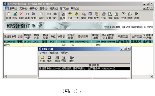 2)請(qǐng)將該100個(gè)“計(jì)劃訂單”投放成“生產(chǎn)任務(wù)單”,并下達(dá)該生產(chǎn)任務(wù)單,見下圖:2。