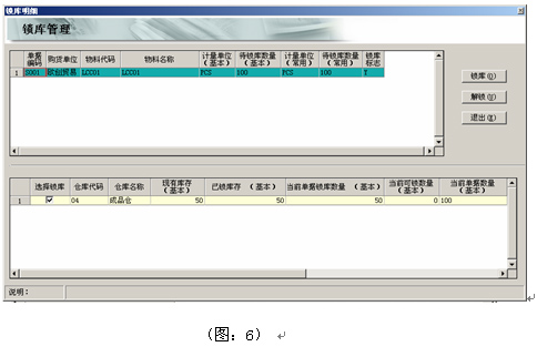 5)首先通過鎖庫(kù)功能對(duì)銷售訂單SO01進(jìn)行鎖庫(kù)處理,將生產(chǎn)任務(wù)單WORK000010已入庫(kù)的50PCS進(jìn)行鎖庫(kù)(圖:6)