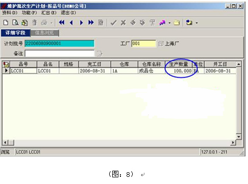 1)選擇SO01進(jìn)行計(jì)算LRP,系統(tǒng)產(chǎn)生100數(shù)量之“生產(chǎn)計(jì)劃”(圖:8);
