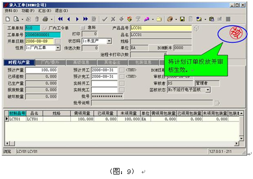 2)將該100個(gè)“計(jì)劃訂單”投放成“工單”,讓這張工單審核生效(圖:9)。