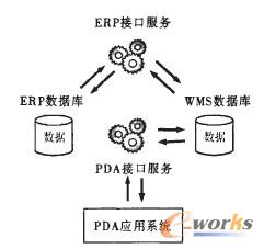 軟件系統(tǒng)包括倉(cāng)儲(chǔ)管理系統(tǒng)、PDA應(yīng)用系統(tǒng)、PDA接口服務(wù)與ERP接口服務(wù)。設(shè)計(jì)方案有兩種形式:一是“延伸型”,利用現(xiàn)有ERP的倉(cāng)儲(chǔ)管理模塊功能,開(kāi)發(fā)PDA現(xiàn)場(chǎng)數(shù)據(jù)采集和現(xiàn)場(chǎng)業(yè)務(wù)操作的PDA應(yīng)用程序,提供ERP倉(cāng)儲(chǔ)管理向現(xiàn)場(chǎng)延伸的觸角,如圖2所示。WMS中不存儲(chǔ)真正意義的倉(cāng)儲(chǔ)業(yè)務(wù)數(shù)據(jù),僅存儲(chǔ)用戶(hù)、權(quán)限等系統(tǒng)數(shù)據(jù)(如虛線所示,通過(guò)ERP接口服務(wù)、PDA接口服務(wù)傳遞系統(tǒng)數(shù)據(jù))。PDA通過(guò)PDA接口服務(wù)獲取業(yè)務(wù)數(shù)據(jù),完成業(yè)務(wù)操作后直接返回給ERP系統(tǒng)。這種方式的特點(diǎn)是開(kāi)發(fā)工作量降低,盡可能地利用了原有ERP的倉(cāng)儲(chǔ)管理功能。二是“完整型”,開(kāi)發(fā)一套完整的條碼倉(cāng)儲(chǔ)管理系統(tǒng),通過(guò)與ERP接口服務(wù),實(shí)現(xiàn)雙向的數(shù)據(jù)實(shí)時(shí)同步,如圖3所示。WMS中存儲(chǔ)了完整的倉(cāng)儲(chǔ)管理數(shù)據(jù),具備完整的倉(cāng)儲(chǔ)管理功能,通過(guò)ERP接口服務(wù)獲取到業(yè)務(wù)數(shù)據(jù),WMS通過(guò)PDA接口服務(wù)指派PDA現(xiàn)場(chǎng)業(yè)務(wù)操作,業(yè)務(wù)操作完成后,WMS通過(guò)ERP接口服務(wù)將數(shù)據(jù)傳回ERP系統(tǒng)。這種方案的特點(diǎn)是彌補(bǔ)了ERP倉(cāng)儲(chǔ)管理功能的不足,同時(shí)保證ERP其它功能的正常運(yùn)行。