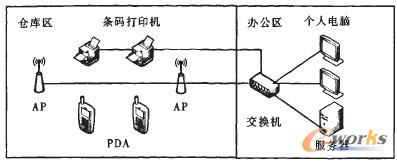 WMS的硬件系統(tǒng)包括服務(wù)器、個(gè)人電腦(PC)、無(wú)線網(wǎng)絡(luò)接入點(diǎn)(AP)、條碼打印機(jī)、掌上微型電腦(Personal Digital Assistant簡(jiǎn)稱(chēng)PDA)、碳帶及標(biāo)簽,硬件系統(tǒng)結(jié)構(gòu)如圖1所示。通過(guò)AP實(shí)現(xiàn)現(xiàn)場(chǎng)PDA與服務(wù)器之間的無(wú)線連接,由于金屬零件及金屬貨架可能會(huì)對(duì)信號(hào)產(chǎn)生一定的干擾,因此AP布置的位置及數(shù)量需要根據(jù)現(xiàn)場(chǎng)實(shí)地測(cè)試情況來(lái)確定?梢赃m當(dāng)?shù)卦黾覣P布置數(shù)量并設(shè)置相同ID名稱(chēng),當(dāng)一個(gè)AP有故障或信號(hào)受到干擾時(shí),PDA會(huì)自動(dòng)連接到信號(hào)最強(qiáng)的AP上,保障數(shù)據(jù)傳遞的安全性。如果有室外庫(kù)區(qū),需要采用防水標(biāo)簽和防水碳帶,配備單獨(dú)的打印機(jī),避免打印防水標(biāo)簽時(shí)更換標(biāo)簽及碳帶的麻煩。PDA數(shù)量按照庫(kù)管員人數(shù)配備,每個(gè)庫(kù)管員使用并負(fù)責(zé)保管PDA,責(zé)任明確,便于管理。
