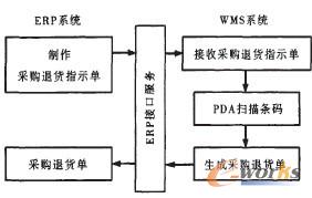 采購(gòu)?fù)素洏I(yè)務(wù)(類(lèi)似出庫(kù))流程如圖7所示,首先由WMS通過(guò)ERP接口服務(wù)接收ERP采購(gòu)?fù)素浿甘締巍DA通過(guò)PDA接口服務(wù)自動(dòng)獲得待退貨物品明細(xì),庫(kù)管員根據(jù)PDA指示的庫(kù)位及數(shù)量掃描物品條碼,物品下架。PDA自動(dòng)生成采購(gòu)?fù)素泦紊蟼鱓MS和ERP,完成采購(gòu)?fù)素浟鞒獭?/P>