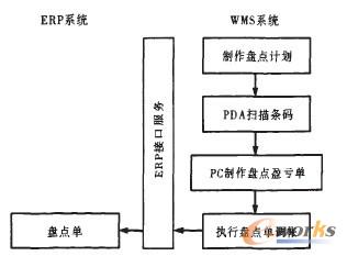 盤(pán)點(diǎn)業(yè)務(wù)流程如圖8所示,首先在WMS中按庫(kù)區(qū)或物品種類(lèi)制作盤(pán)點(diǎn)計(jì)劃,PDA通過(guò)PDA接口服務(wù)自動(dòng)獲得待盤(pán)點(diǎn)物品明細(xì),庫(kù)管員按照PDA指示的待盤(pán)點(diǎn)物品的庫(kù)位及數(shù)量掃描物品條碼,完成盤(pán)點(diǎn)錄入并上傳到WMS。WMS將錄人數(shù)據(jù)與庫(kù)存數(shù)據(jù)進(jìn)行比較,生成盤(pán)點(diǎn)盈虧單,盤(pán)點(diǎn)盈虧單經(jīng)審批后方可執(zhí)行盤(pán)點(diǎn)調(diào)帳。通過(guò)ERP接口服務(wù)將盤(pán)點(diǎn)單上傳ERP,完成盤(pán)點(diǎn)流程。
