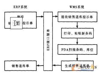 銷(xiāo)售退庫(kù)(類(lèi)似入庫(kù))可分兩種情況,一種是使用退庫(kù)物品原有條碼,另一種是重新生成條碼。兩種方式的區(qū)別在于是ERP主導(dǎo)還是WMS主導(dǎo)。本系統(tǒng)采用退庫(kù)重新生成打印條碼的方式,以ERP為主導(dǎo),WMS輔助執(zhí)行。