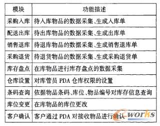 根據(jù)上述設(shè)計(jì)的方案,WMS系統(tǒng)的PC應(yīng)用程序?qū)崿F(xiàn)的功能如表2所示,PDA應(yīng)用程序?qū)崿F(xiàn)的功能如表3所示。