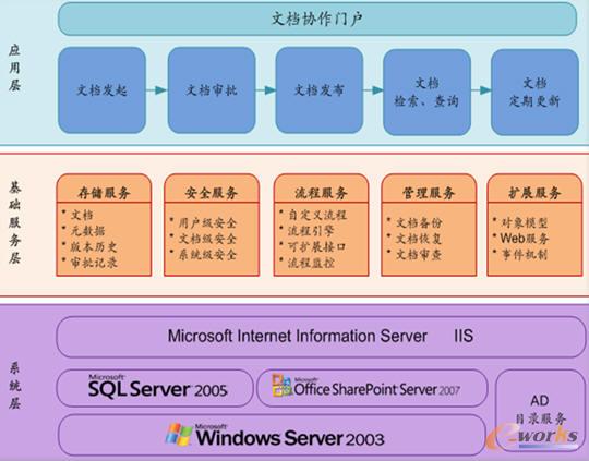 文檔管理控制解決方案為三層架構(gòu),分別是系統(tǒng)層、基礎(chǔ)服務(wù)層、應(yīng)用層。