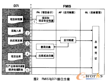 綜上所述,F(xiàn)MIS與D71的接口方案如圖2所示,其中:①-項目及預算從F}VIIS中導人到D71;②D71采購接收事務自動產(chǎn)生會計總帳憑證導人FMIS;③-D71發(fā)票接收事務自動傳遞到FMIS的應付、總帳,并進行費用歸集;④-D71中的項目出庫事務自動產(chǎn)生會計憑證導人FMIS,并進行項目成本歸集;⑤-D71中的其他出庫事務、庫存調(diào)整和差異處理等自動產(chǎn)生會計總帳憑證導人FMIS.