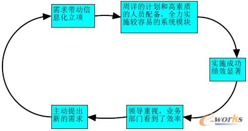 三菱的成功還歸功于它實施一開始定下的“由簡入難,由淺入深,分步實施”的信息化實施原則。這種分步實施大大降低了應用的風險,也減小了變革的幅度和因此帶來的阻力。而且三菱ERP系統(tǒng)初步實施中選擇的切入點選擇的好,從比較容易見成效的地方開始的原則。這使得它的ERP實施一開頭就有了良好的效果,好的開端帶來了后來的好的進展,形成了良性的循環(huán),保證了項目的順利實施,從而達到了三菱今天的成功。如圖2所示: