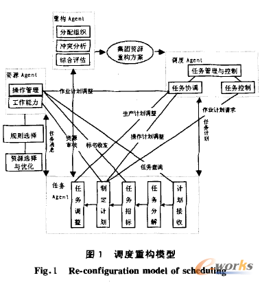 DRERP系統(tǒng)中的多Agent重構(gòu)機(jī)制采用了合同網(wǎng)和啟發(fā)式規(guī)則相結(jié)合的協(xié)調(diào)方式來(lái)實(shí)現(xiàn)調(diào)度規(guī)則和策略的重構(gòu).該系統(tǒng)的資源調(diào)度重構(gòu)模型如圖 1所示.在此模型中,調(diào)度Aegtn將生產(chǎn)計(jì)劃細(xì)化后生成任務(wù)Agent,并生成一個(gè)任務(wù)計(jì)劃,同時(shí)將有關(guān)信息告知任務(wù)Agent,消息內(nèi)容的格式為:{作業(yè)名稱,單位作業(yè)的基本任務(wù),任務(wù)所需資源表,期限,其他約束,任務(wù)標(biāo)識(shí)}.