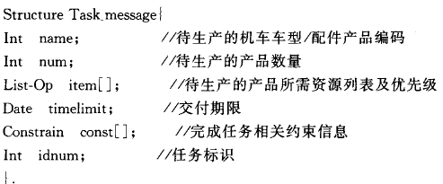 例如,當(dāng)有新訂單計(jì)劃發(fā)生時(shí),調(diào)度Agent:通過(guò)用戶接口接收新訂單,然后通過(guò)與其他Agent (銷售Agent生產(chǎn)計(jì)劃Agent、物供Agent、庫(kù)存Agent、采購(gòu)Agent等)接口進(jìn)行信息交互,經(jīng)過(guò)成本Agent進(jìn)行核算分析以及重構(gòu)Agent確定的資源重構(gòu)方案后(對(duì)機(jī)車產(chǎn)品零部件組成進(jìn)行樹(shù)狀結(jié)構(gòu)劃分后,系統(tǒng)規(guī)定產(chǎn)品關(guān)鍵部件,如轉(zhuǎn)向架、內(nèi)燃機(jī)等的優(yōu)先級(jí)最高),產(chǎn)生一個(gè)基本的生產(chǎn)流程計(jì)劃和資源調(diào)度計(jì)劃,并自動(dòng)生成一個(gè)任務(wù)Agent,連同"生產(chǎn)任務(wù)消息"發(fā)送給任務(wù)Agent.以下給出Agent間業(yè)務(wù)交互的2個(gè)消息格式.其中,生產(chǎn)任務(wù)發(fā)布消息格式為: