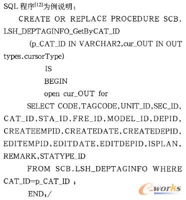 這樣,應(yīng)用程序傳遞給數(shù)據(jù)庫的參數(shù)就只有PL/SQL程序名及p_CAT_ID一個參數(shù),數(shù)據(jù)庫處理后,就可以直接將查詢結(jié)果返回給應(yīng)用程序。數(shù)據(jù)交互變得簡單和高效率。筆者在該項目中,共建立了400多個不同功能的PL/SQL存儲過程序。降低了持久化層應(yīng)用程序與底層數(shù)據(jù)庫之間的耦合關(guān)系,使持久化層的編寫以及數(shù)據(jù)訪問、調(diào)用關(guān)系變得明了,簡單。其他PL/SQL程序類似,不在贅述。