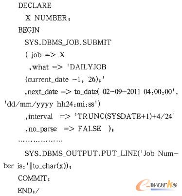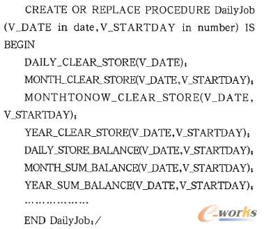 僅以庫房自動盤點程序為例,首先將相應(yīng)分操作設(shè)計為不同的PL/SQL程序。例如DAILY_CLEAR STORE(V_DATE)負責進行每日庫存增量計算,MONTH_CLEAR_STORE(V_DATE,V_STARTDAY)負責進行每月庫存凈增量計算,MONTHTONOW_CLEAR_STORE(V_DATE,V_STARTDAY)負責進行月初至今庫增量計算,YART_CLEAR_CLEAR_STORE(V_DATE,V_STARTDAY),STORE_BALANCE(V_DATE,V_STARTDAY)負責將最終庫存盤點的結(jié)果寫會數(shù)據(jù)庫指定位置,供用戶調(diào)用。然后指定一段存儲過程統(tǒng)領(lǐng)這些PL/SQL程序段執(zhí)行數(shù)據(jù)及參變量。