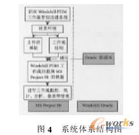 因此,基于Windchill PDM工作流管理系統(tǒng)集成MS Project98系統(tǒng)在理論上是可行的?捎袃煞N方案來進(jìn)行集成:一是利用Windchill PDM中的類和函數(shù)來處理工作流的各種數(shù)據(jù),將之轉(zhuǎn)換成MSProject98可以直接讀取的數(shù)據(jù)格式。但是這種方法需要在Windchill PDM里進(jìn)行一次開發(fā),同時(shí)需要在每臺(tái)需要運(yùn)行本系統(tǒng)的計(jì)算機(jī)上都要安裝有Windchill PDM才能運(yùn)行,對(duì)電腦硬件要求太高,本系統(tǒng)的普遍適用性將大大降低。所以我們采取第一種方案:直接在MS Project98中對(duì)Windchill PDM的ORACLE數(shù)據(jù)庫進(jìn)行操作,讀取其工作流數(shù)據(jù),然后在MS Project98中進(jìn)行處理。本系統(tǒng)體系結(jié)構(gòu)圖如圖4所示。