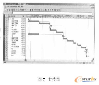 其一,MS Project 98對(duì)工作流程的監(jiān)控、統(tǒng)計(jì)、分析和報(bào)表功能較強(qiáng)大。它利用甘特圖來進(jìn)行任務(wù)在時(shí)序關(guān)系上的監(jiān)視和管理,甘特圖用水平線段表示任務(wù)的工作階段,線段的起點(diǎn)和終點(diǎn)分別對(duì)應(yīng)著任務(wù)的開工時(shí)間和完成時(shí)間,線段的長(zhǎng)度表示完成任務(wù)所需的時(shí)間。甘特圖優(yōu)點(diǎn)是標(biāo)明了各任務(wù)的計(jì)劃進(jìn)度和當(dāng)前進(jìn)度,能動(dòng)態(tài)地反映項(xiàng)目開發(fā)進(jìn)展。圖3是一個(gè)典型的甘特圖。MS Project98利用各種資源視圖和報(bào)表統(tǒng)計(jì)、打印功能來滿足用戶對(duì)工作流程的資源分配和使用、人員分配以及成本等等方而的管理要求。