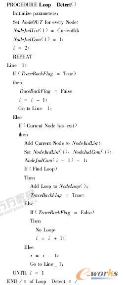 因?yàn)樵谘h(huán)的最后一次執(zhí)行時(shí),在執(zhí)行完關(guān)鍵路徑部分后,直接執(zhí)行反饋閉環(huán)外的下一個(gè)任務(wù)(如圖6的任務(wù)A)不執(zhí)行反饋體部分,所以關(guān)鍵路徑部分要比反饋體部分多執(zhí)行一次,因而關(guān)鍵路徑部分要執(zhí)行K+1次。要解決反饋問題,首先要識(shí)別工作流中的閉環(huán),然后才能按照上而的方法表達(dá)。我們采用人工智能技術(shù)中的深度優(yōu)先搜索算法來識(shí)別工作流中的閉環(huán),這種算法是完備的,可以識(shí)別出所有的閉環(huán)。深度優(yōu)先搜索算法如下: