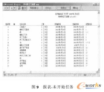 運(yùn)行Windchill PDM工作流管理改進(jìn)系統(tǒng)后,首先彈出對(duì)話框,顯示該工作流存在1個(gè)閉環(huán),用戶輸入反饋體需要執(zhí)行的次數(shù)為2后,執(zhí)行得到如圖7所示的甘特圖顯示。用戶還可以選擇不同的視圖來管理該流程。例如選擇顯示統(tǒng)籌圖,則可以得到如圖8所示的統(tǒng)籌圖信息。該視圖直觀地體現(xiàn)了任務(wù)之間的邏輯時(shí)序關(guān)系,可供工作人員監(jiān)控工作流程。如圖9所示的未開始任務(wù)報(bào)表則統(tǒng)計(jì)了所有到目前還未開始的任務(wù),并以報(bào)表形式打印。