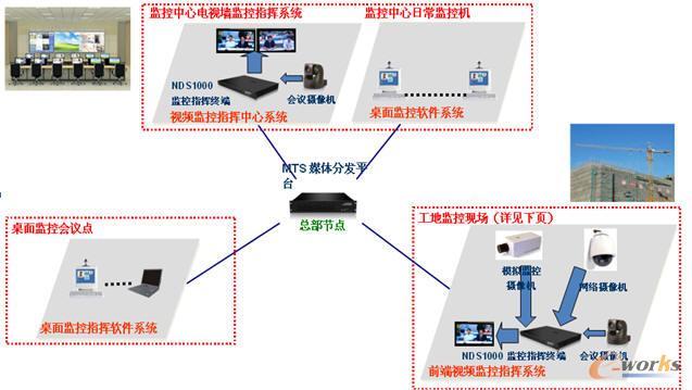(4)在大型工地塔吊等不便埋線的監(jiān)控位置,安裝微波收發(fā)設(shè)備及IP Camera網(wǎng)絡(luò)攝像機,其他位置安裝光纖接入的模擬監(jiān)控攝像機;配置1臺MGS媒體網(wǎng)關(guān)服務(wù)器為當?shù)鼐钟蚓W(wǎng)內(nèi)的網(wǎng)絡(luò)攝像機提供媒體轉(zhuǎn)接服務(wù);使用1臺NDS1000監(jiān)控指揮終端,接入室內(nèi)會議攝像機,對本地工地畫面進行監(jiān)看的同時,也可進行視頻會議并被遠程監(jiān)看;