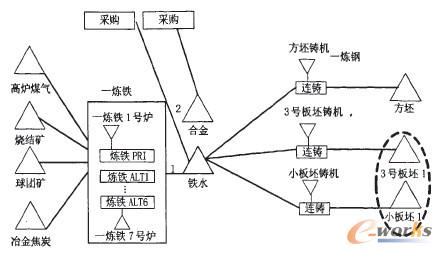 一煉鐵1號(hào)高爐是主要工藝路線和BOM,2號(hào)、3號(hào)、4號(hào)、5號(hào)、6號(hào)高爐是替代工藝路線和替代BOM,7號(hào)高爐供應(yīng)三煉鋼(圖中未表示),線中的1、2,表示供應(yīng)的優(yōu)先級(jí),一煉鐵鐵水優(yōu)先供給一煉鋼,不能滿足一煉鋼需求時(shí),再由供應(yīng)商供應(yīng)(即采購(gòu))。