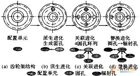 配置單元替換進化常被用來進行局部結(jié)構(gòu)的選項設(shè)計,例如,將原來采用球軸承的支承結(jié)構(gòu)置換為圓錐滾子軸承后,能承受更大的軸向力。如圖1(d)所示為在圓柱齒輪上輻板孔的替換進化過程,對鑄件齒輪,將輻板孔(圓孔)定義為被替換單元,通過替換進化將圓孔置換為輻射孔,并繼承其配置信息。