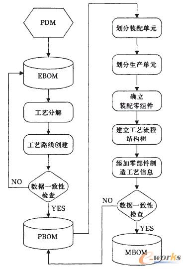 MBOM是在PBOM數(shù)據(jù)結(jié)構(gòu)的基礎(chǔ)上,首先進(jìn)行產(chǎn)品裝配單元的劃分,并對每個(gè)裝配單元再細(xì)分為若干個(gè)生產(chǎn)單元,確定生產(chǎn)單元中需參加裝配的零組件,對每個(gè)生產(chǎn)單元編制裝配工藝;按照產(chǎn)品裝配單元結(jié)構(gòu)關(guān)系,確定各裝配單元的裝配層次,形成裝配單元結(jié)構(gòu)樹,按照裝配順序,確定裝配層次,形成關(guān)系結(jié)構(gòu)樹。裝配單元結(jié)構(gòu)樹和裝配關(guān)系結(jié)構(gòu)樹關(guān)聯(lián)形成工藝流程結(jié)構(gòu)樹;從PBOM獲取每份裝配工藝中需參加裝配的零組件工藝分工路線及零組件的工藝信息,最終形成完整的MBOM信息。