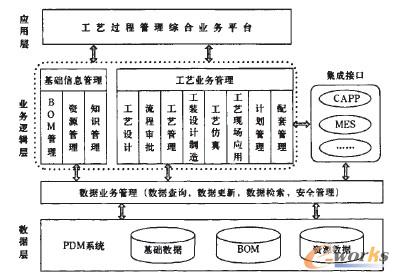 2)業(yè)務(wù)邏輯層由基礎(chǔ)信息管理和工藝業(yè)務(wù)管理兩個(gè)模塊組成;A(chǔ)信息管理包括BOM數(shù)據(jù)管理、資源管理、知識(shí)管理功能;工藝業(yè)務(wù)管理包含工藝設(shè)計(jì)、流程審簽、工藝管理、工裝設(shè)計(jì)制造、工藝仿真、工藝現(xiàn)場應(yīng)用、計(jì)劃管理以及配套管理等功能。