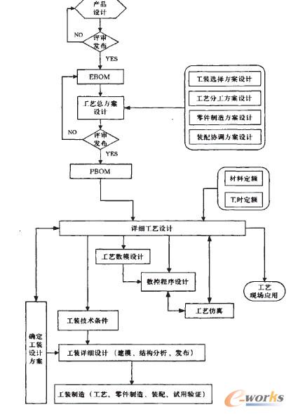 工藝部門接收EBOM后,結(jié)合工裝部門,零部件制造車間,根據(jù)車間生產(chǎn)技術(shù)條件及物資儲(chǔ)備情況制定產(chǎn)品的工藝設(shè)計(jì)總方案。該方案包含工裝選擇方案設(shè)計(jì),工藝分工方案設(shè)計(jì),裝配協(xié)調(diào)方案設(shè)計(jì),零件制造方案設(shè)計(jì)等。工藝總方案經(jīng)過評審?fù)ㄟ^后發(fā)布。
