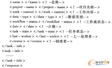 (4)登錄PDM系統(tǒng)后,查詢該用戶的當(dāng)前工作,然后組織成XML信息返回給OA系統(tǒng),其XML格式如下: