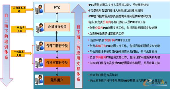 為將PDM系統(tǒng)有效、有序地推廣應用,確保PDM用戶熟練操作PDM系統(tǒng),公司內部舉辦PDM系統(tǒng)全面推廣培訓。以項目為單位,先項目組,后職能科室。建立其自上而下的培訓體系,培養(yǎng)核心PDM應用骨干,同時形成自下而上的推廣應用技術支持體系。