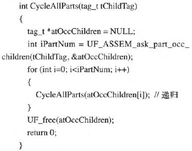 為了獲取總成中所有節(jié)點的信息,需要遍歷總成的整個裝配結(jié)構(gòu)。常用的遍歷方法有深度優(yōu)先法與廣度優(yōu)先法兩種,本系統(tǒng)采用深度優(yōu)先法,深度優(yōu)先法遍歷裝配結(jié)構(gòu)的基本算法如下:首先獲取裝配結(jié)構(gòu)的根節(jié)點,然后獲取根節(jié)點的子部件。對每個子部件遞歸求解下一級子部件,如此循環(huán),直到子部件為單個零件。以下是實現(xiàn)遍歷裝配結(jié)構(gòu)功能的代碼。