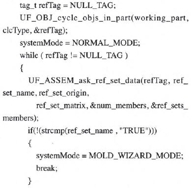 在NX注塑模環(huán)境下,有些零件中存在多個用于輔助建模的實體,在計算零件備料信息時,系統(tǒng)需要找到零件的真正實體,本系統(tǒng)通過使用True和False引用集來區(qū)分零件的真正實體和輔助實體。因此為了正確計算出零件的備料尺寸,首先判斷是否存在True引用集。具體實現(xiàn)代碼如下: