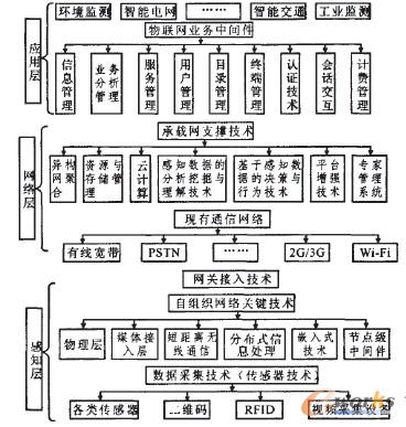 根據(jù)產(chǎn)業(yè)技術(shù)鏈的相關(guān)理論,要了解物聯(lián)網(wǎng)產(chǎn)業(yè)技術(shù)鏈,首先應(yīng)明確物聯(lián)網(wǎng)的體系架構(gòu)及其每一層所涉及的關(guān)鍵技術(shù);诂F(xiàn)有對物聯(lián)網(wǎng)體系架構(gòu)及其所涉及的關(guān)鍵技術(shù)的研究成果,本文通過描繪物聯(lián)網(wǎng)技術(shù)體系架構(gòu)(見圖1),來說明物聯(lián)網(wǎng)產(chǎn)業(yè)技術(shù)鏈。