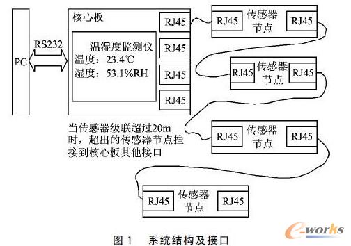 系統(tǒng)結(jié)構(gòu)及接口如圖1所示。4個(gè)DHT22傳感器需要4根數(shù)據(jù)線,加上電源和地線共6根線。系統(tǒng)采用雙絞線作為分布式連接線路,RJ45作為接口器件。核心板設(shè)計(jì)了4個(gè)RJ45接口,4個(gè)傳感器可分別接入4個(gè)接口。核心板的4個(gè)RJ45接口內(nèi)部連接一致,當(dāng)布線不超過20 m時(shí),傳感器可采用咬尾式接口方式(即僅接入核心板的1個(gè)接口),當(dāng)超過20 m時(shí)單獨(dú)布線,大幅節(jié)約了布線成本,降低了布線難度。