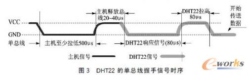 用戶主機(jī)(MCU)發(fā)送一次開始信號(hào)后,DHT22從低功耗模式轉(zhuǎn)換到高速模式;主機(jī)開始信號(hào)結(jié)束后,DHT22發(fā)送響應(yīng)信號(hào),送出40 bit的數(shù)據(jù),并觸發(fā)一次信號(hào)采集。