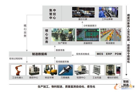 - 通過(guò)對(duì)數(shù)控設(shè)備、工業(yè)機(jī)器人和現(xiàn)場(chǎng)檢測(cè)設(shè)備的集成,實(shí)時(shí)獲取制造裝備狀態(tài)、生產(chǎn)過(guò)程進(jìn)度以及質(zhì)量參數(shù)控制的第一手信息,并傳遞給執(zhí)行層與管控層,實(shí)現(xiàn)車間制造透明化,為敏捷決策提供依據(jù);